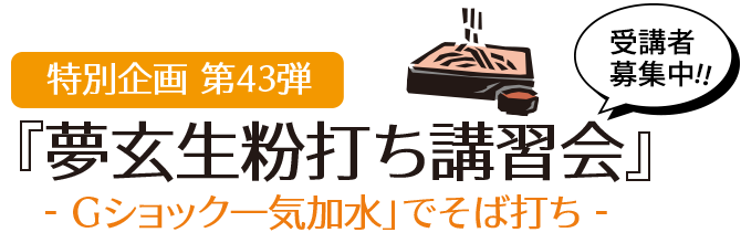 今回の講習会では、まもなく新発売します銘柄【黒耀】のお披露目を兼ねて、「Gショック一気加水」で10割そばを打っていただきます。【黒耀】は、玄ソバと丸抜きをブレンドして大型石臼製粉したそば粉です。エグミを生かした濃厚な味が特徴で、黒い星(点々)が少し飛び、黒い光沢を放っているので【黒耀】と命名しました。すでにお蕎麦屋さんにはお出ししておりますが、そばを噛んで食べる方が多い関西方面のお店にご好評を頂いております。